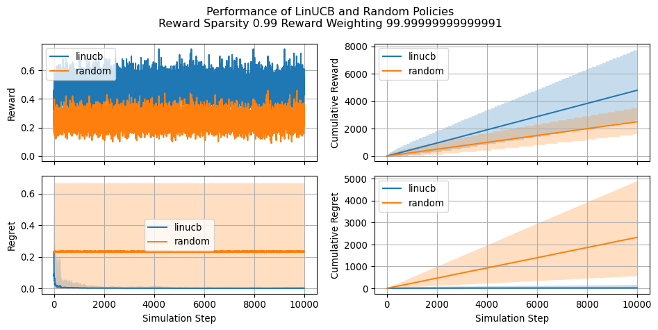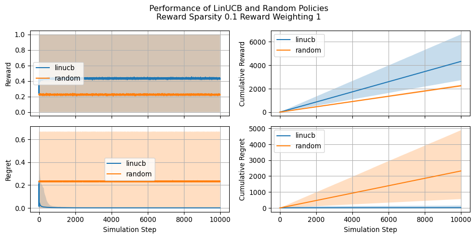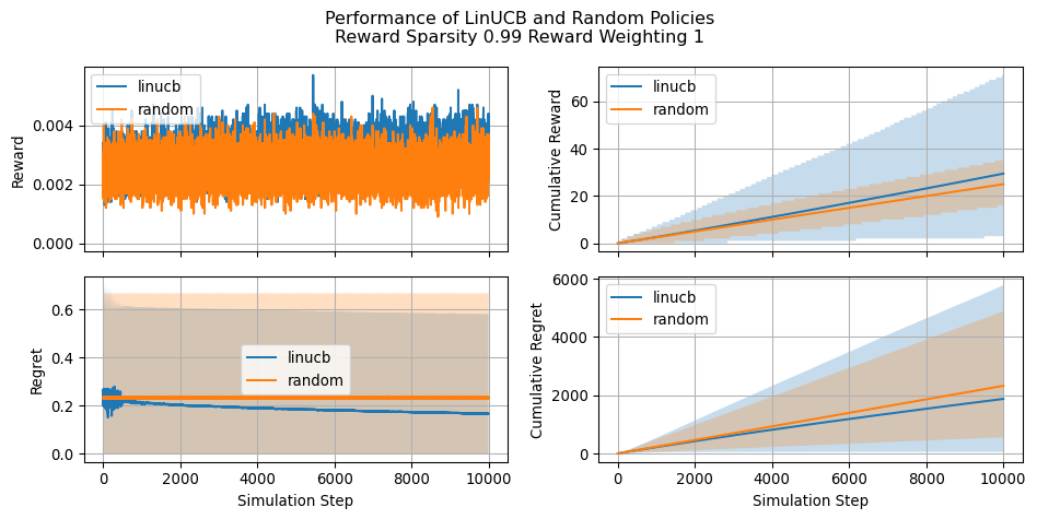 Let’s see now how our implementation of LinUCB compares against a naive random policy and how the estimated parameters changes during the simulation. Let’s keep in mind that greater (cumulative) reward indicates a more effective policy. Conversely, a lower cumulative regret is indicative of a better policy. We will see that regret becomes a particulary useful when asessing the performance in situations where reward is very sparse.