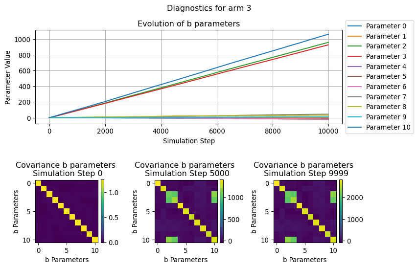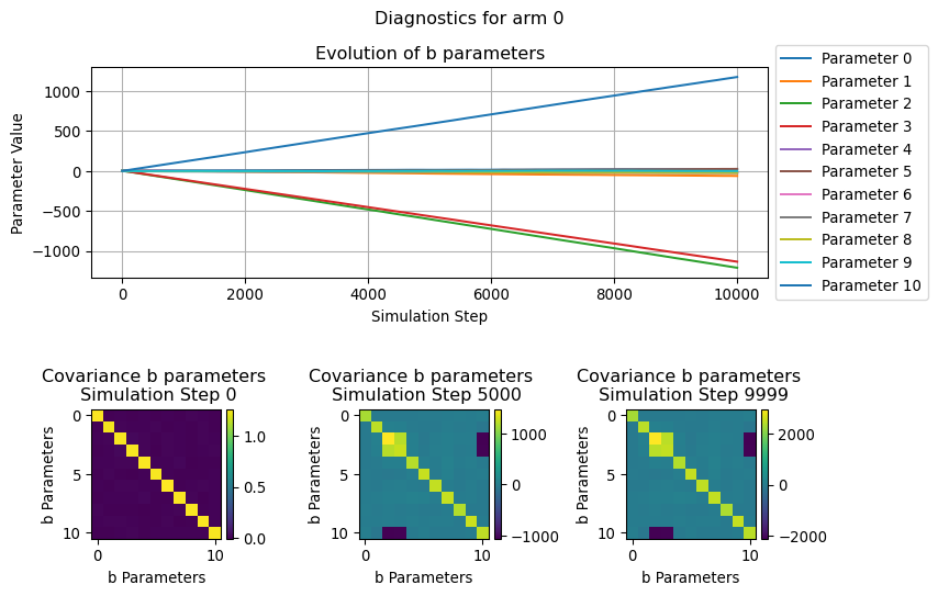 Similarly, the evolution of the covariance illustrate how the relationship between the various b parameters change over the simulation steps.